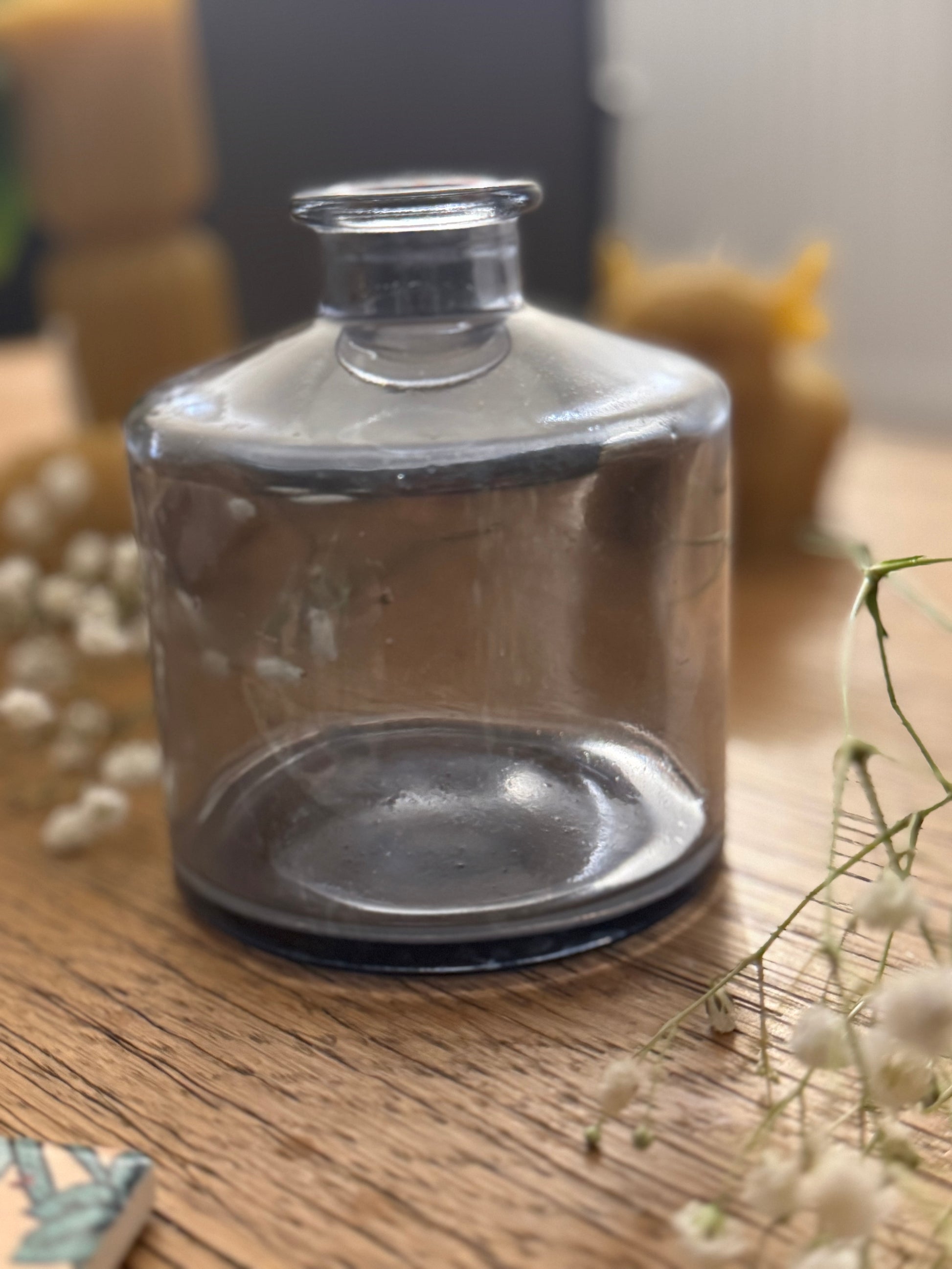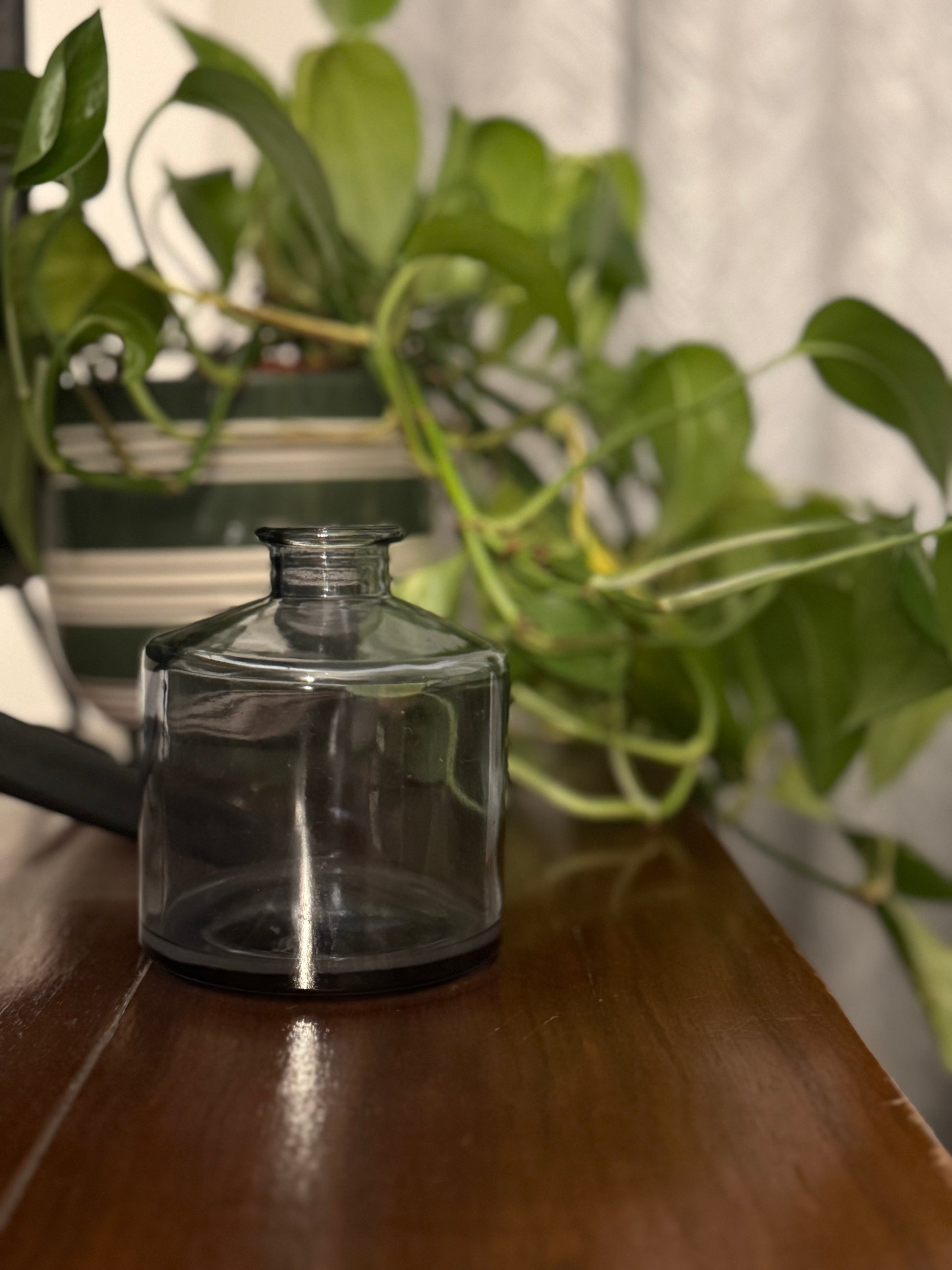 Formed from smoky, translucent glass, it shifts with the light, deepening in the evening and softening under the sun. The smooth cylindrical body and short, poised neck give it a sense of calm presence, whether resting on a writing desk, a windowsill, or a favourite shelf.
