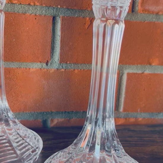 A beautifully delicate pair of vintage pressed glass candlesticks, fluted and faceted to catch the light just so. Their gently tapering stems and patterned bases add a touch of quiet elegance to any corner — from a laid table to a softly styled shelf.